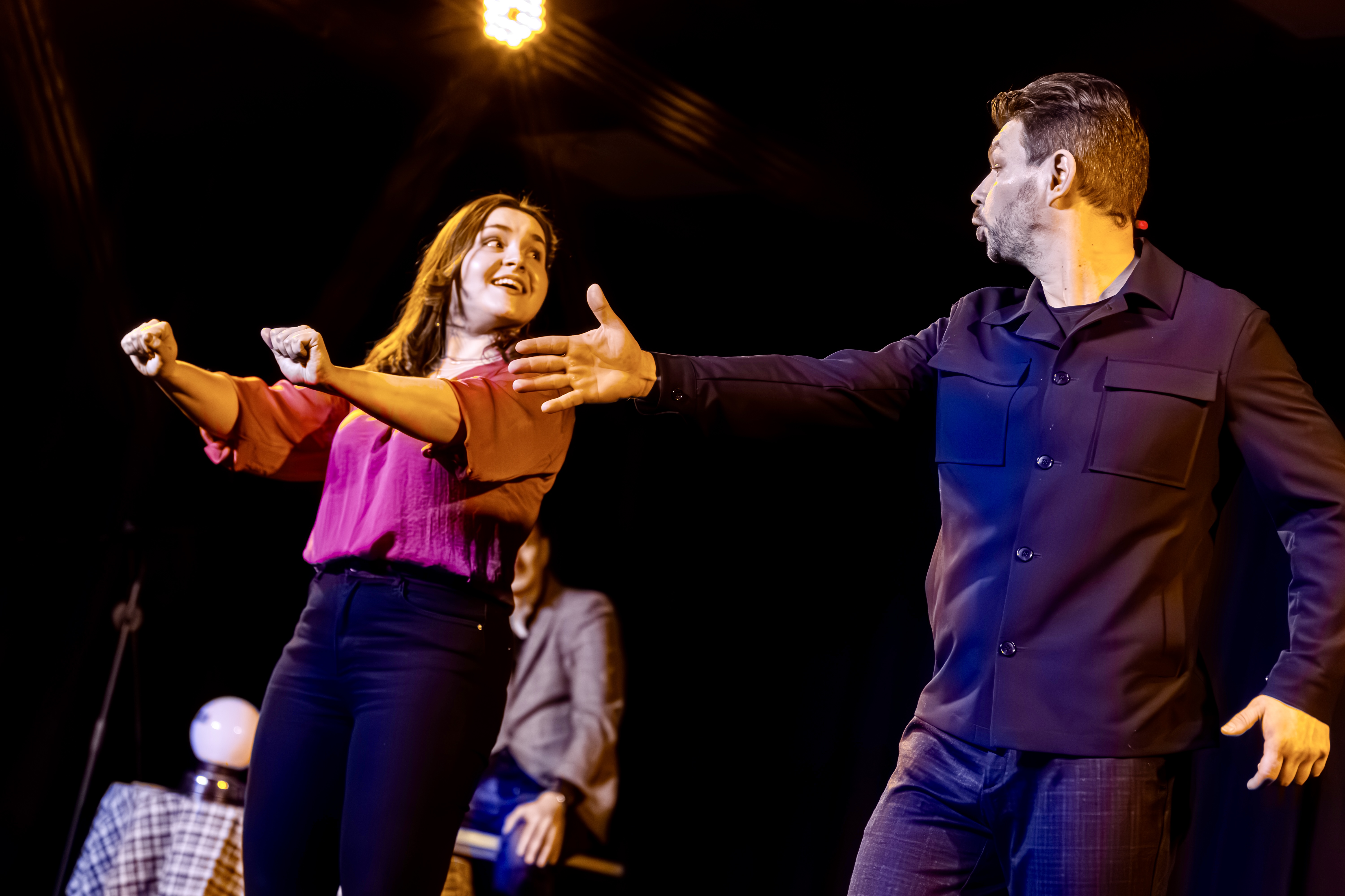 Актори взаємодіють з глядачами протягом всієї вистави та дають можливість взяти участь в імпровізації або задати тему раунду.